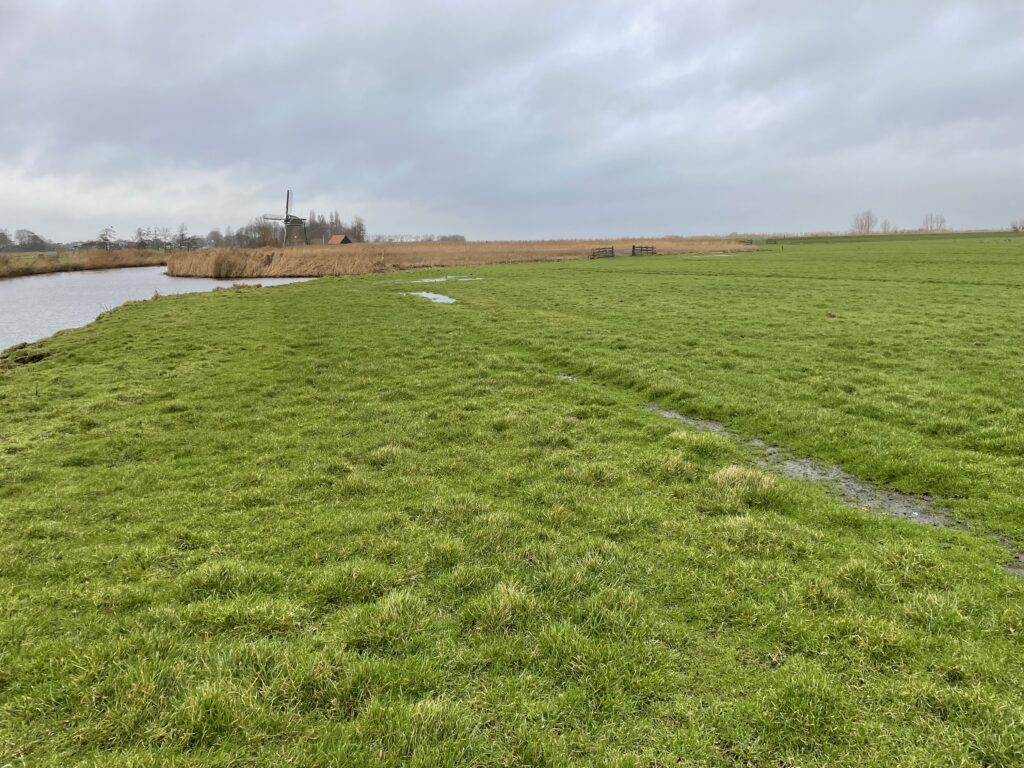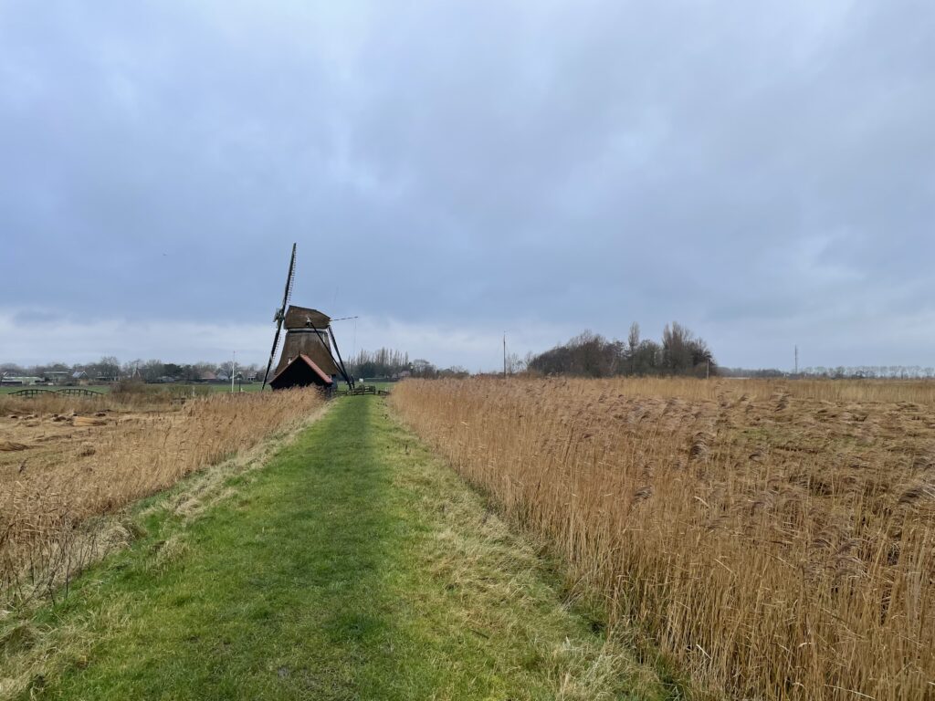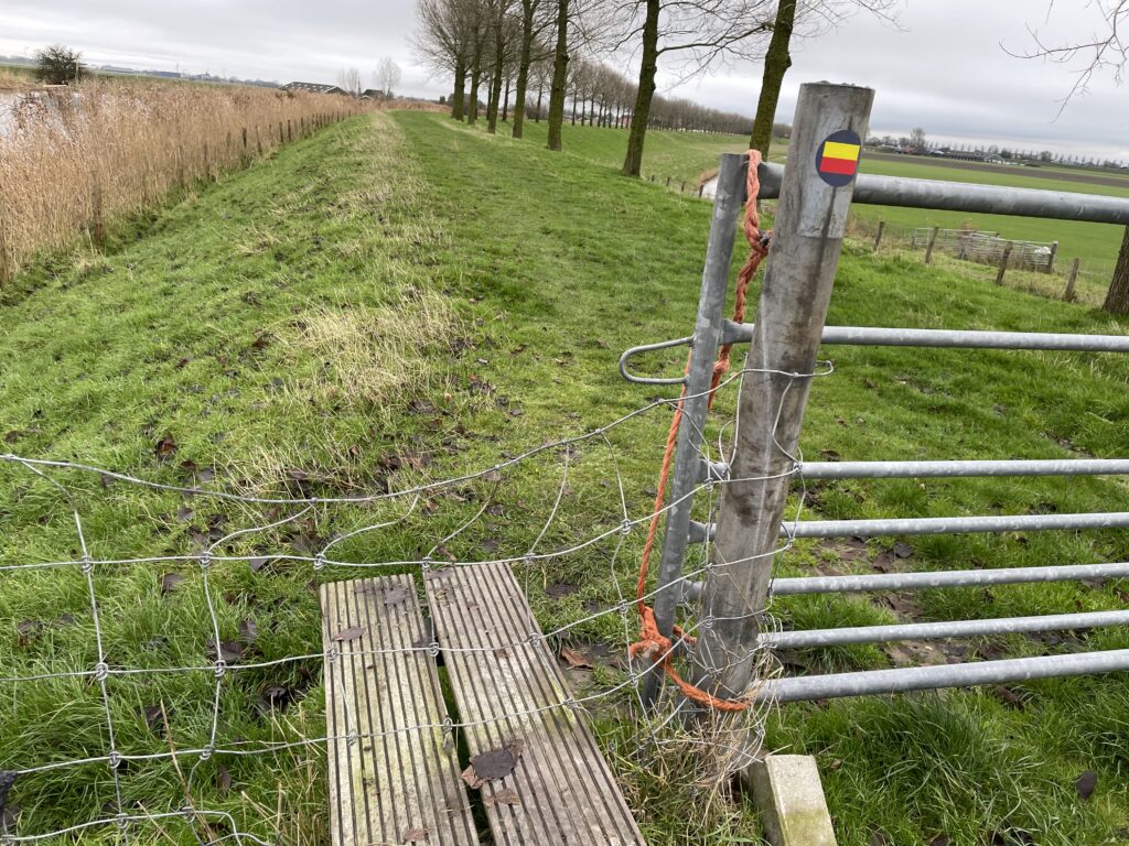 De route van asfalt en klinkers werd soms onderbroken door wandelpaden door weilanden of over dijken. Die waren erg nat en glibberig, maar wel leuk voor de afwisseling. En ach, hard ging het toch niet meer.