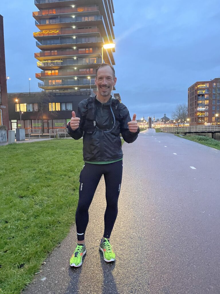 Ik nam 3,2 liter water met Tailwind mee (waterzak 2 liter en 2x 600ml flessen) en een stuk of 8 Chia Charge reepjes. Daar moest ik het wel mee redden, dacht ik. Even voor achten vertrok ik, waarbij ik navigeerde op m’n horloge. Na 2 km kwam ik al een bekende tegen, Richard Veenstra. Ik deed het lekker rustig aan en het navigeren ging goed. Bij Wormerveer moest ik over een onverhard wandelpad achter een industrieterrein en langs een kanaal lopen. Na een paar kilometer moest daar een pontje liggen waarmee je zelf kon overvaren, maar die lag er niet…