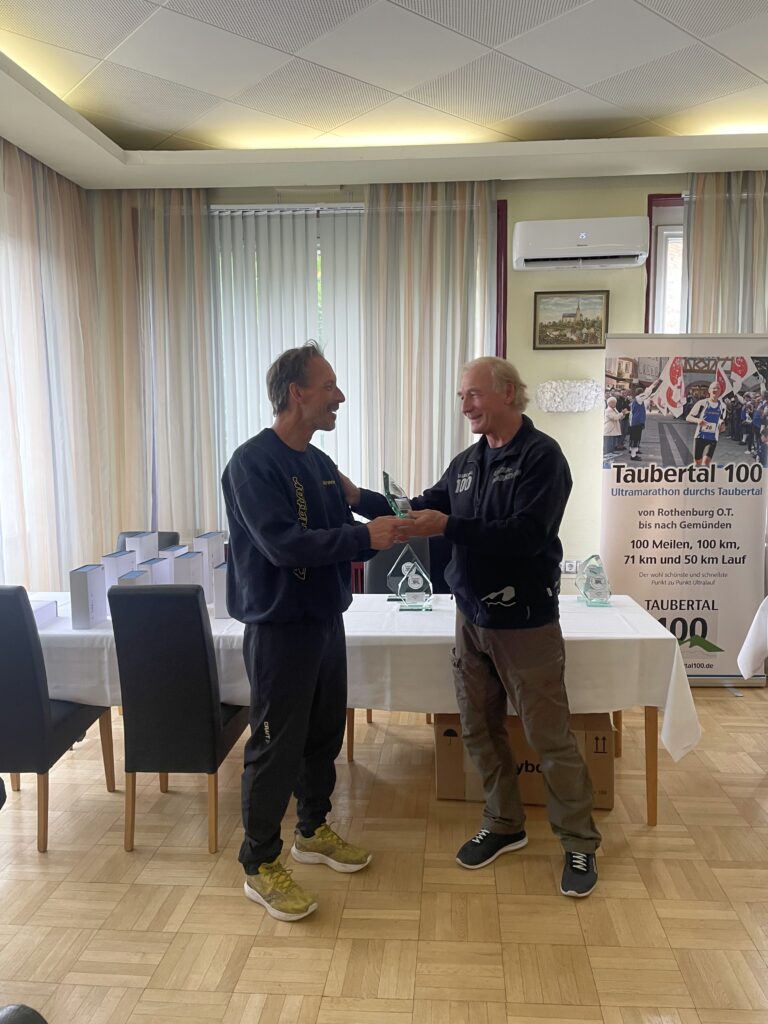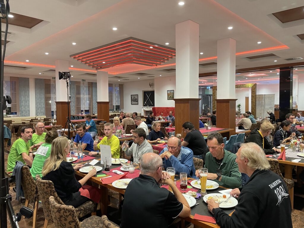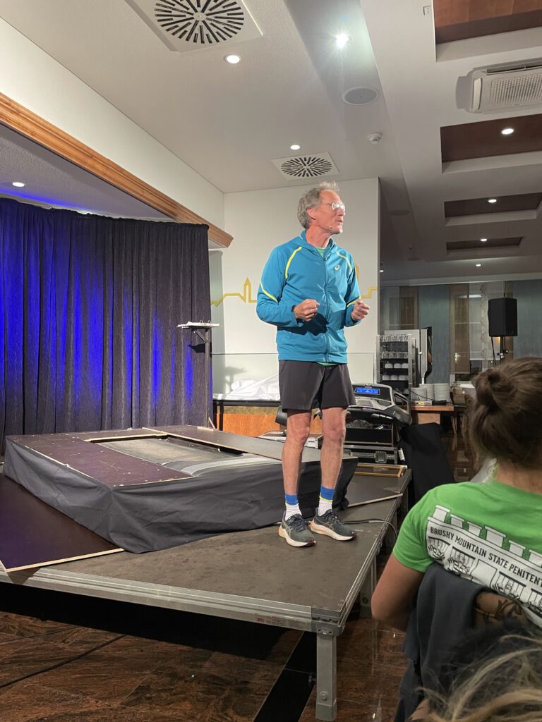 Barbara en ik waren uitgenodigd aan de ‘green table’, waar organisator Hubert Beck zat met eerdere deelnemers. Aangezien er maar drie waren, mochten ook lopers van de 100 mijl en 200 km aanschuiven. Na een heerlijk diner was er een voorstelling van Dieter Boumann, een 5000 meter-loper die goud won op de Olympische Spelen van 1992. Hij beeldde op amusante wijze verschillende types uit terwijl hij op een loopband liep en deed alsof hij zijn eerste 100 km in 2011 in Biel liep.