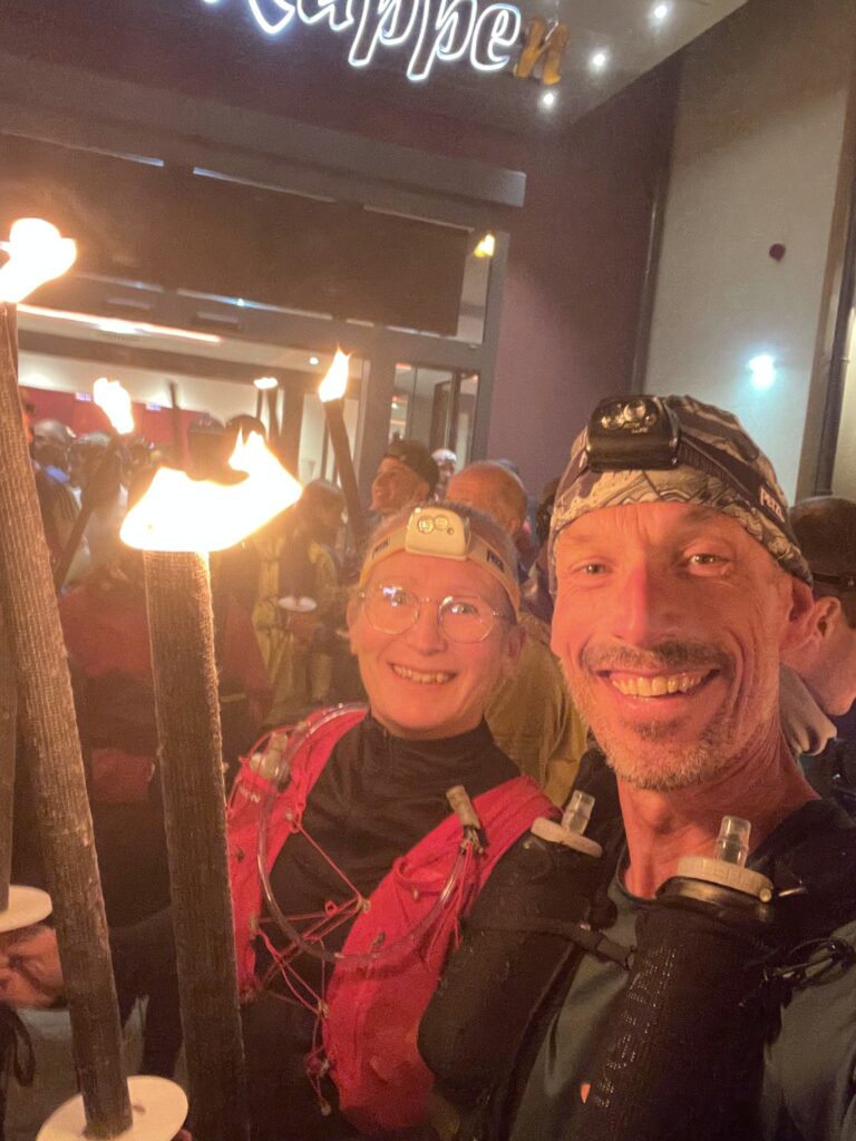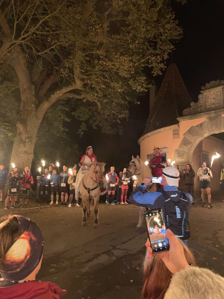 Om 5.15 uur verzamelden we buiten het hotel. We kregen allemaal een fakkel, die we aanstaken en vervolgens, wandelend/dribbelend, gingen we het dorp in. Dat was een heel bijzonder moment. Na iets meer dan een kilometer verschenen een koningin en een ridder te paard die ons een opdracht gaven en veel succes wensten. We doofden de fakkels en dribbelden verder naar de startlocatie. Mijn hartslag zat boven de 200 (ik droeg een hartslagband), wat me even deed schrikken.